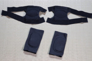 往時は膝だこが出来て一人前とされましたが、現代では長期的な稽古と、床座生活が一般的でなくなったこと、また時に板の間より硬い床で稽古を行うこともあるという事情から、膝サポーターを利用します。