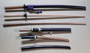 また江戸期の天心流では、初学者向けとして竹をくり抜いて鞘の代用としました。これは鞘全部ではなく、鯉口(入り口)近から栗形程度までの長さでしたが、鞘の代用としては十分でした。現代ではサランラップの芯などに木剣を挿せば、十分に鞘の代用として機能します。